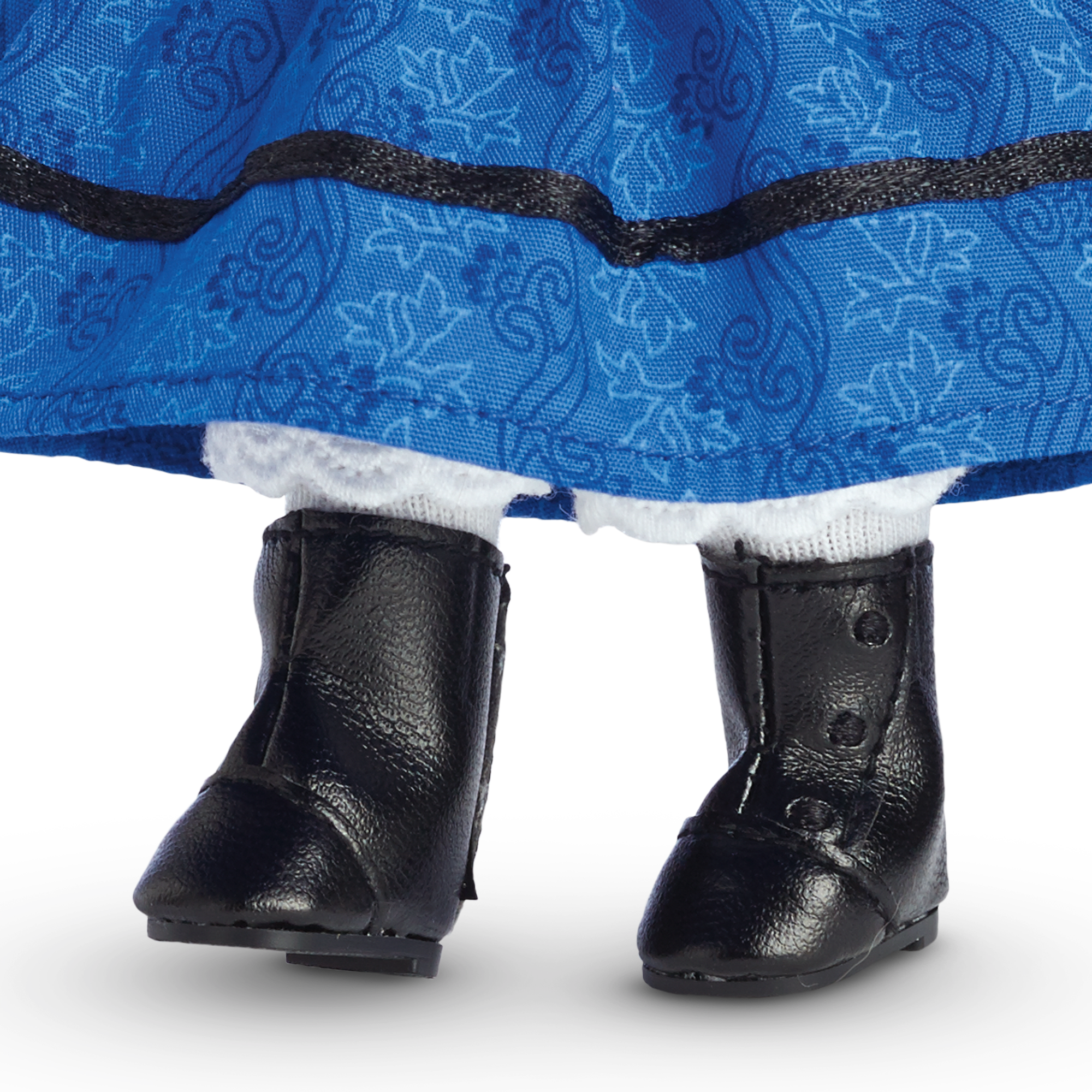 The 6.5″ (16.5 cm) Addy mini doll has deep-brown painted eyes and thick black hair. Her smooth vinyl limbs are posable. She arrives in a tiny version of Addy’s authentic 1864 outfit featuring a blue dress with black ribbon trim, and has little golden hoop earrings in her ears. Includes a mini abridged version of the book Finding Freedom.