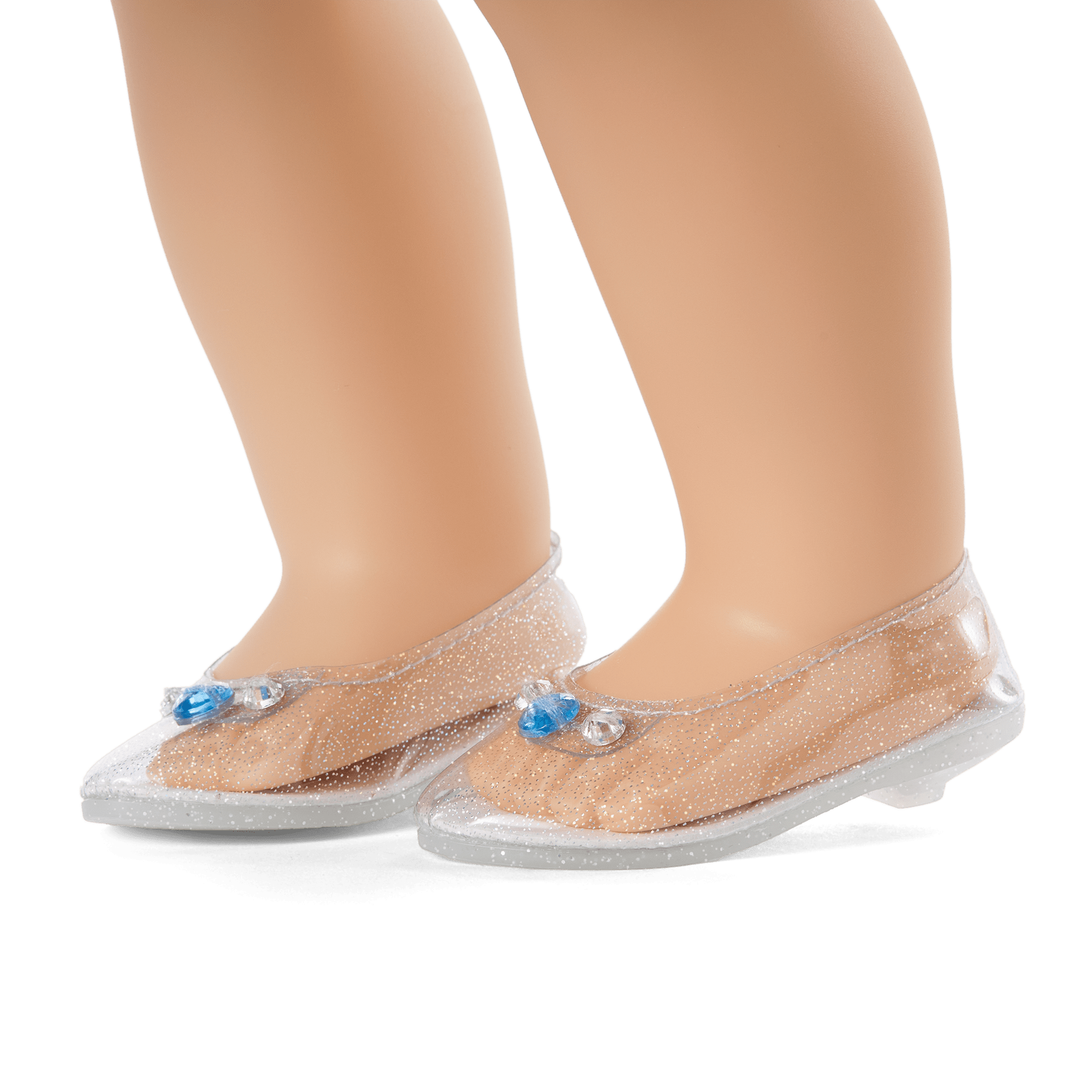A pair of glittery “glass slippers” with kitten heels and rhinestones at the toes