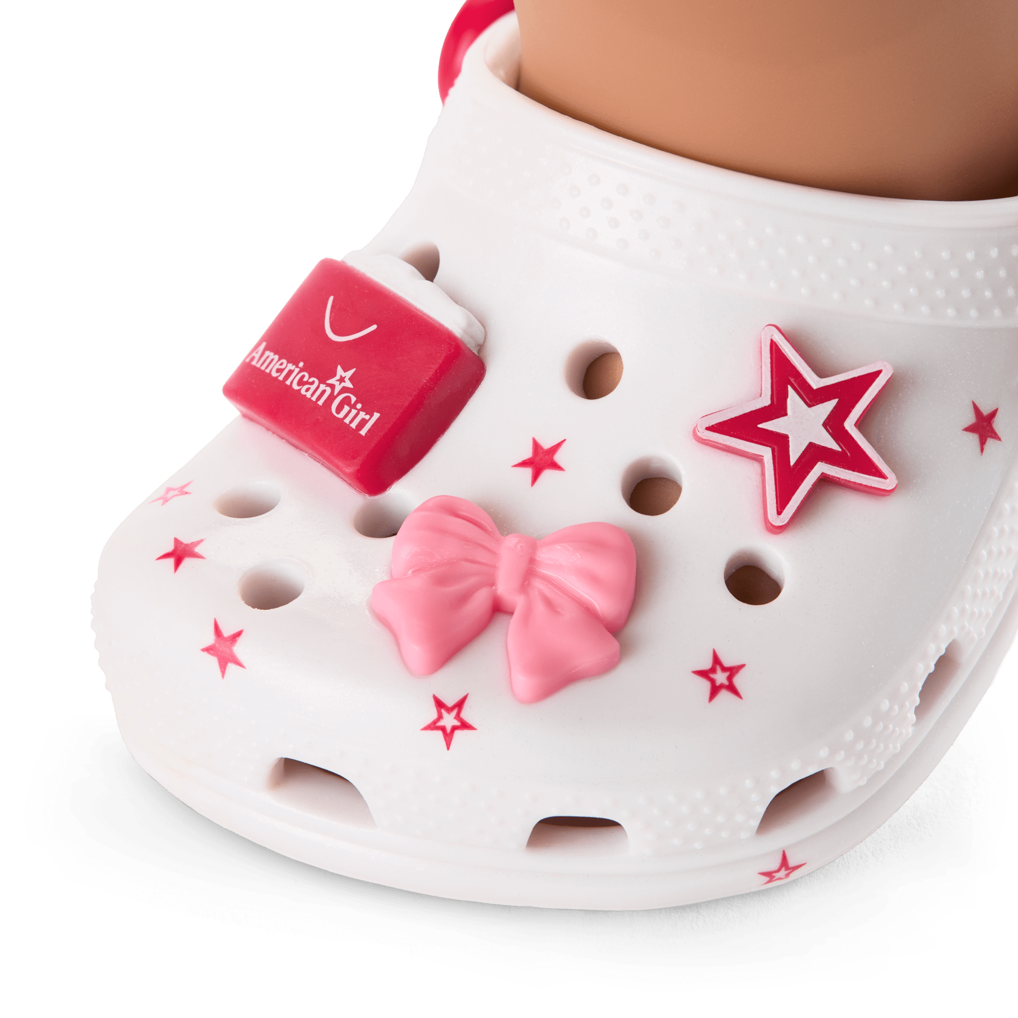A pair of pearlized white Crocs Classic Clog shoes featuring a sprinkle of berry-colored stars, a berry-colored heel strap with a white American Girl logo, rivets with the AG star and Crocs logos, and a set of permanently attached Jibbitz: the AG star and monogram, an AG café teacup, a berry-colored shopping bag, a hairbow, and a silhouette of a girl reading from the original Pleasant Company logo.