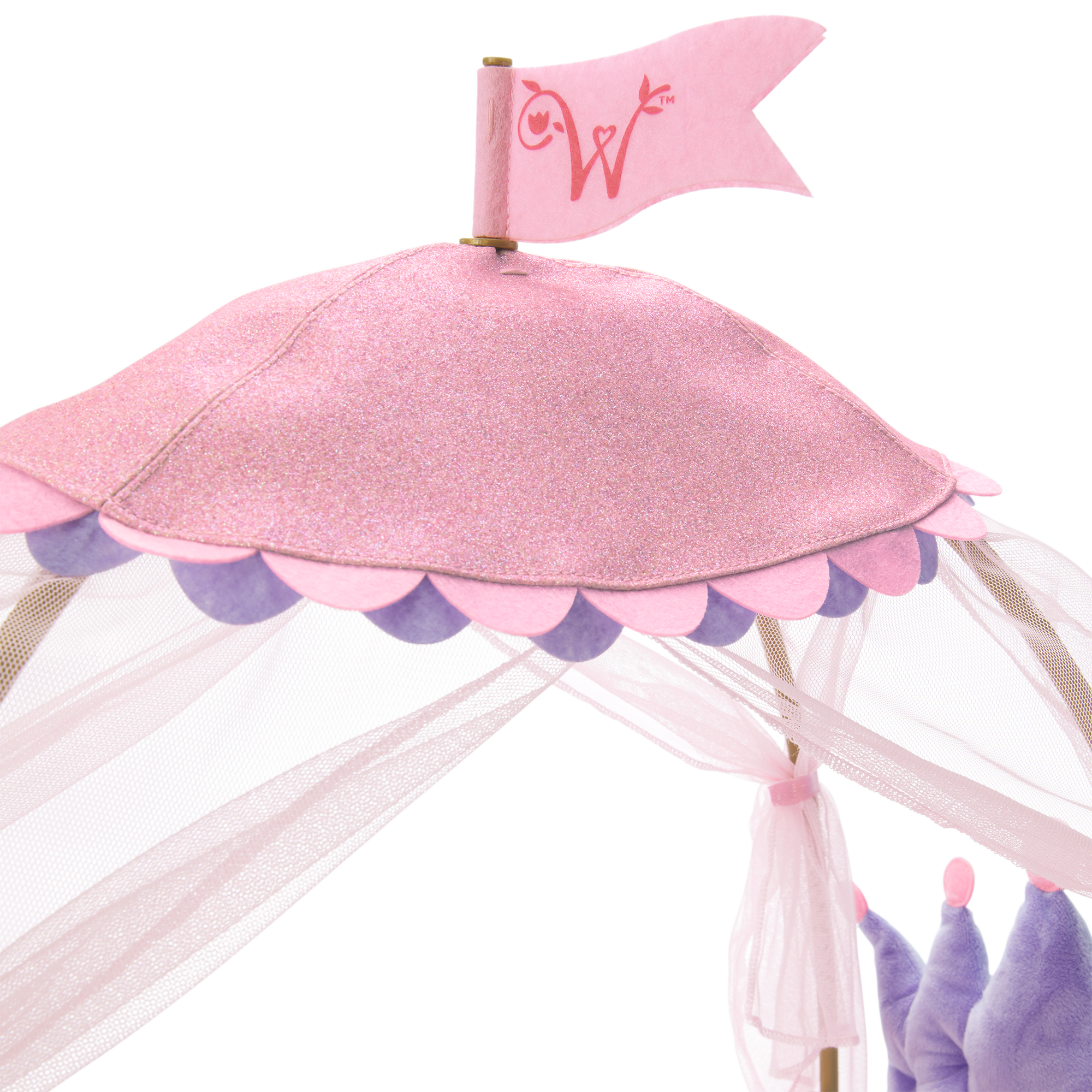 Royal Canopy Bed for WellieWishers Dolls: A soft plush fabric bed with a crown-shaped headboard, a sparkly canopy, and a blanket with a royal-themed print