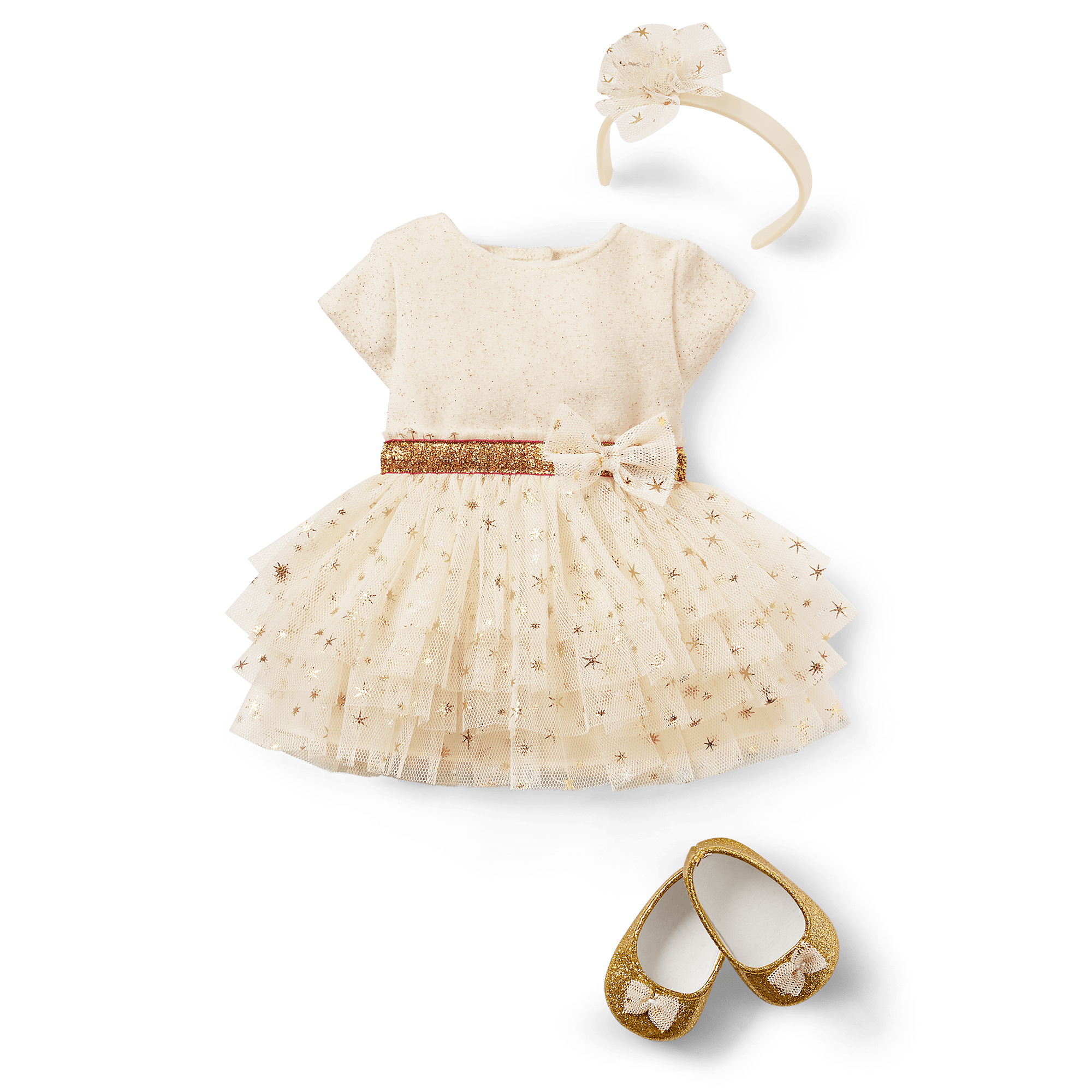 Golden Twinkle Dress for Bitty Baby Dolls: A cream velour dress with layers of mesh printed with golden stars and snowflakes, plus sparkly shoes and a coordinating headband