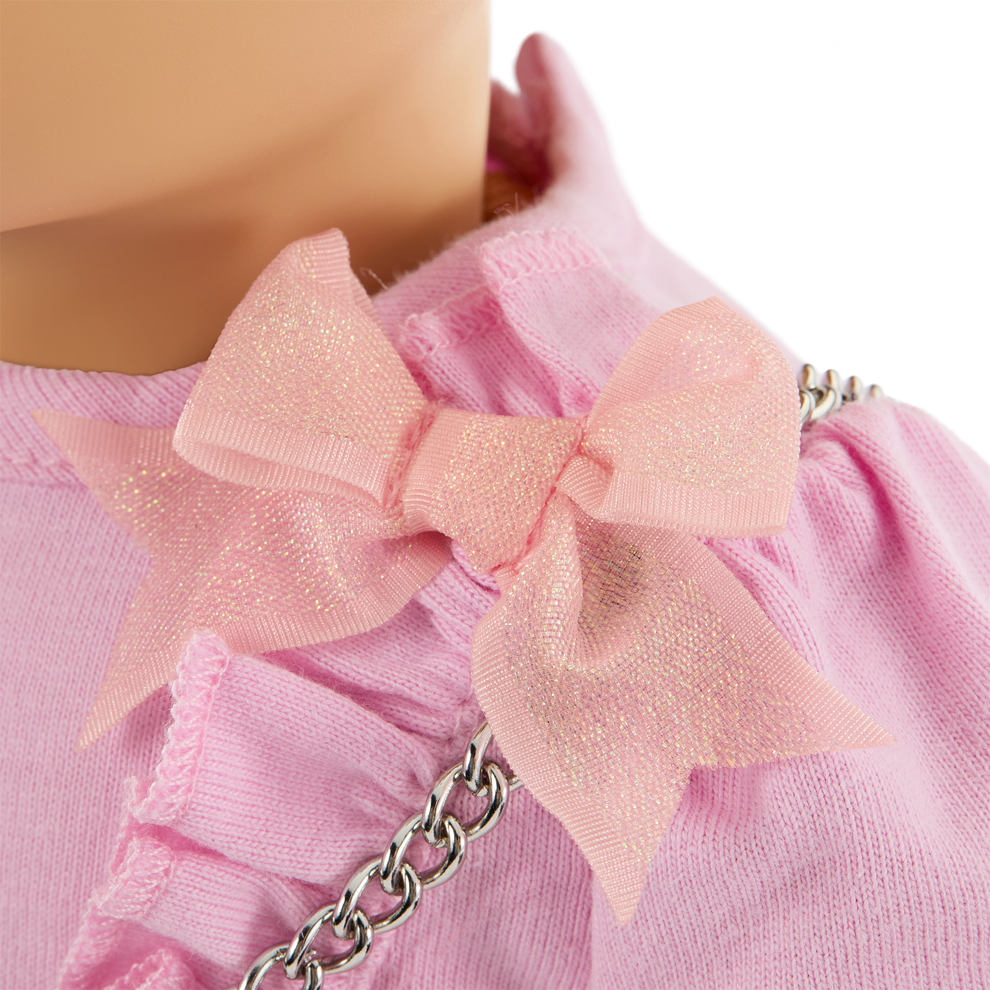 A pink long-sleeved cotton jersey top with an asymmetrical ruffle topped with a light pink iridescent bow on the left shoulder