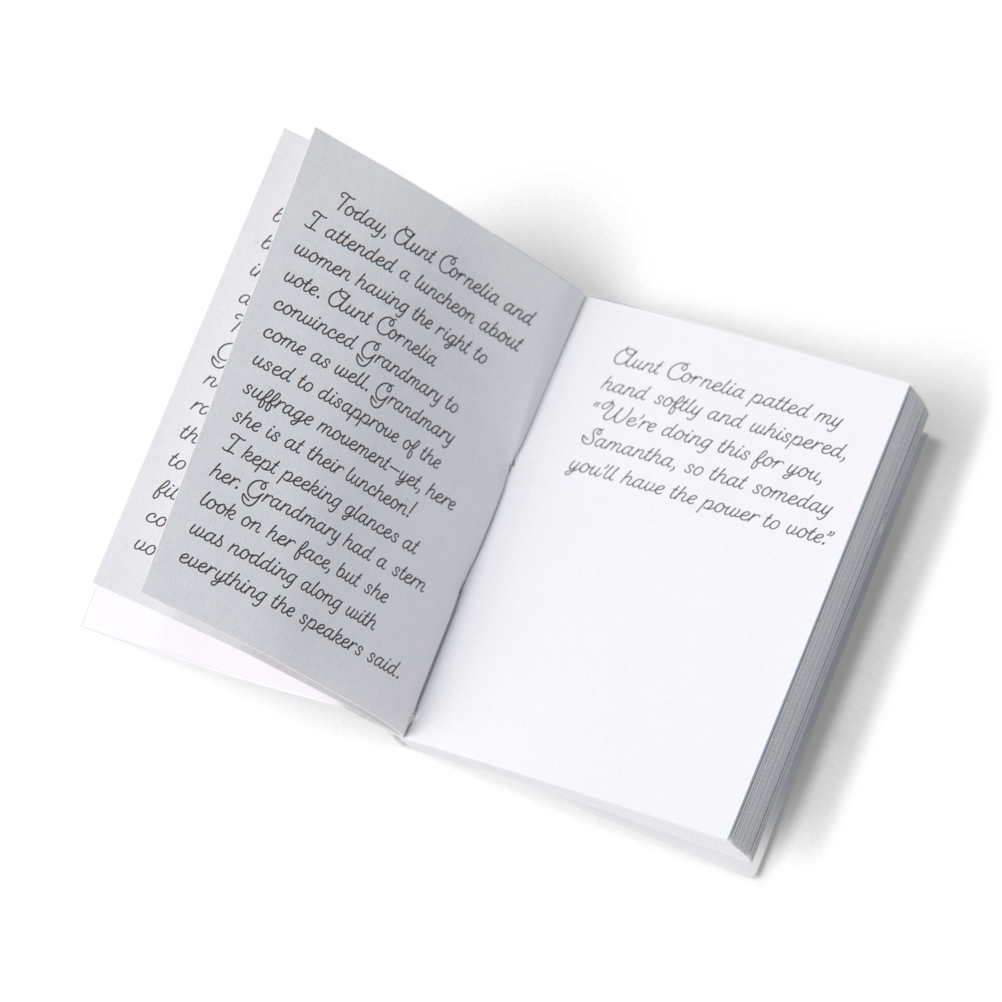 Raquel 18-inch Doll & Journal: An 18″ Raquel doll with brown eyes that open and close, and dark-brown hair styled in a front ponytail with a gingham bow. She has a soft cotton body, and her movable head and limbs are made of smooth vinyl. The Raquel doll arrives in an outfit inspired by her great-great-grandmother Samantha Parkington’s iconic look: a pink-and-plum gingham-print top, a gingham-print full skirt, and a matching hair tie with a fabric bow. Also includes a bracelet, a pair of pink platform shoes, and a pair of underwear, plus the illustrated paperback book The Diary of Raquel Reyes.